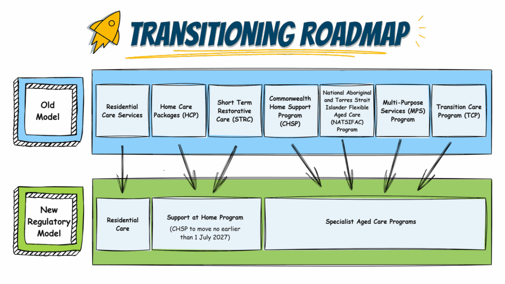 The infographic below illustrates how aged care programs will be transitioned to the new regulatory model, noting that the Commonwealth Home Support Program will only be fully integrated under the Support at Home Program in 2027 and cease to exist as a standalone program. Until then, it will be referred to as the Specialist Aged Care Program but will be regulated under the new Aged Care Act (see CHSP Providers section for more details)